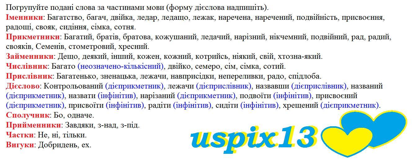 Погрупуйте подані слова за частинами мови (форму дієслова надпишіть).