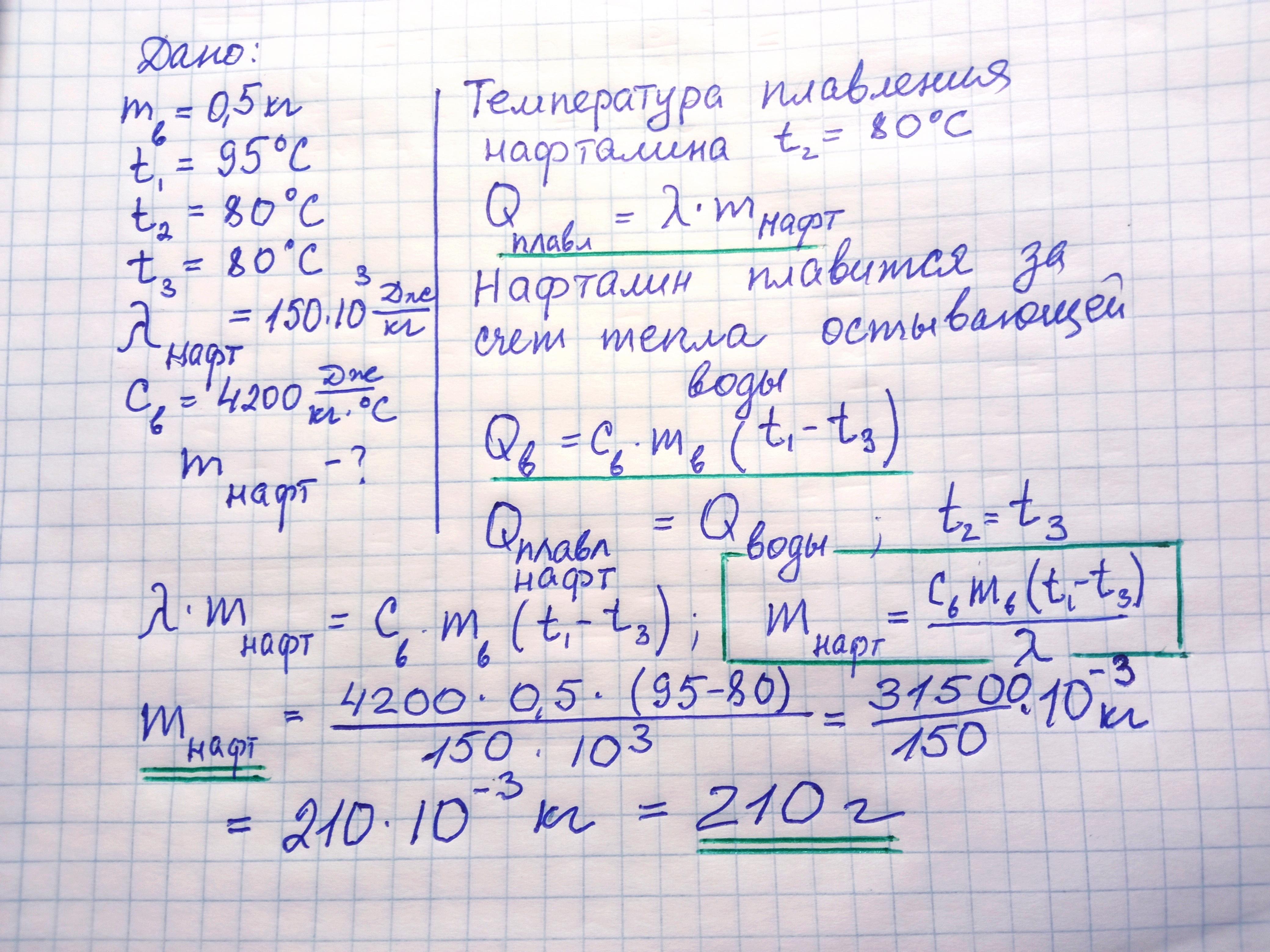 6. Воду масою 500 г при температурі 95°С налили в теплоізольований посудину, де знаходився твердий нафталін при температурі 80 °С. Після встановлення теплової рівноваги температура води дорівнювала 80 °С, при цьому весь нафталін перейшов у рідкий стан. Нехтуючи втратами тепла, оцініть, скільки грамів нафталіну перебувало у посудині. °C), питома теплота плавлення Питома теплоємність води дорівнюс 4200 Дж/кг нафталіну 150 кДж/кг, температура плавлення нафталіну 80 °С.