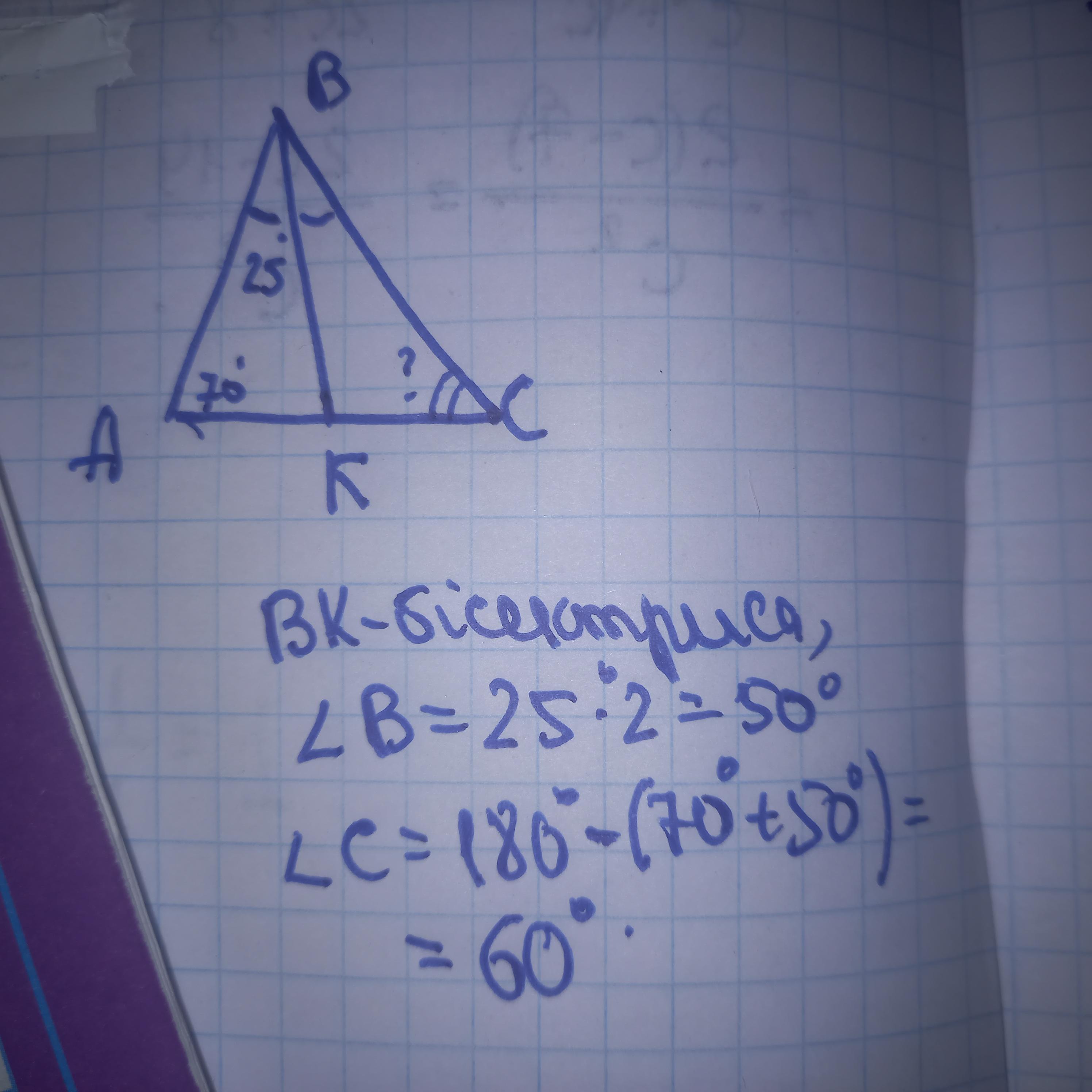 У трикутнику АВС: ∠A = 70°, ВК - бісектриса трикутника; ABK = 25°. Знайти градусну міру кута С.