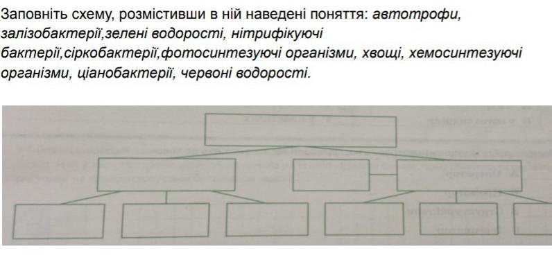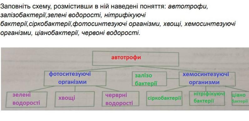 Заповніть схему, розмістивши в ній наведені поняття: автотрофи, залізобактерії, зелені водорості, нітрифікуючі бактерії,сіркобактерії,фотосинтезуючі організми, хвощі, хемосинтезуючі організми, ціанобактерії, червоні водорості.