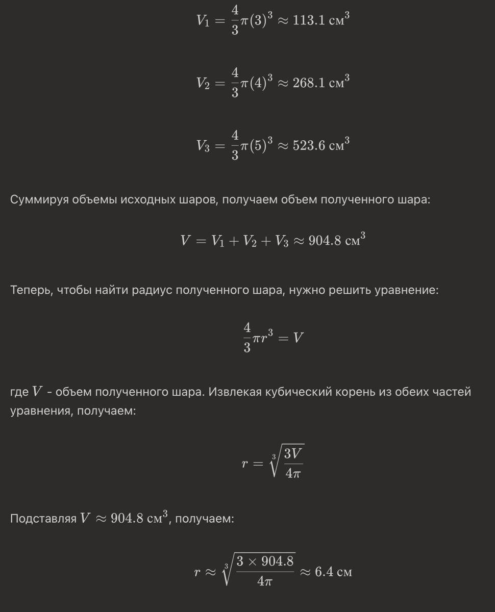 Три металлических шара, радиусы которых равны 3 см, 4 см и 5 см, расплавили и из полученного металла отлили один шар. Каков радиус полученного шара? Потерями металла при переплавке пренебречь.