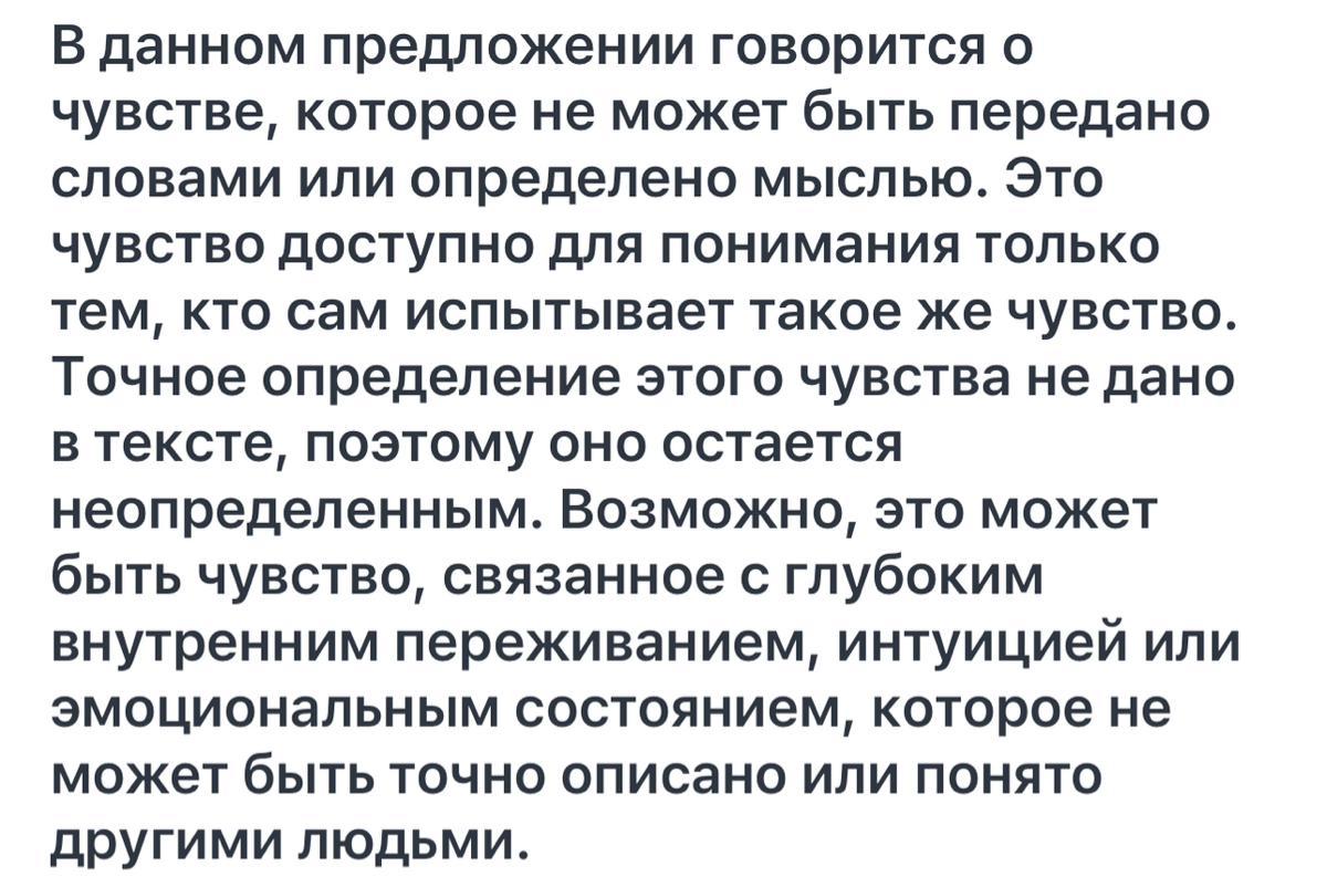 В данном предложении говорится о чувстве, которое не может быть передано словами или определено мыслью. Это чувство доступно для понимания только тем, кто сам испытывает такое же чувство. Точное определение этого чувства не дано в тексте, поэтому оно остается неопределенным. Возможно, это может быть чувство, связанное с глубоким внутренним переживанием, интуицией или эмоциональным состоянием, которое не может быть точно описано или понято другими людьми.