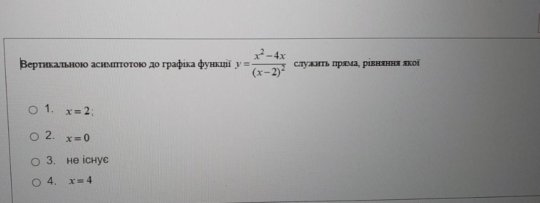 Вертикальною асимптотою до графіка функції y=x^2-4x/( x-2)^2 Служить пряма , рівняння якої: