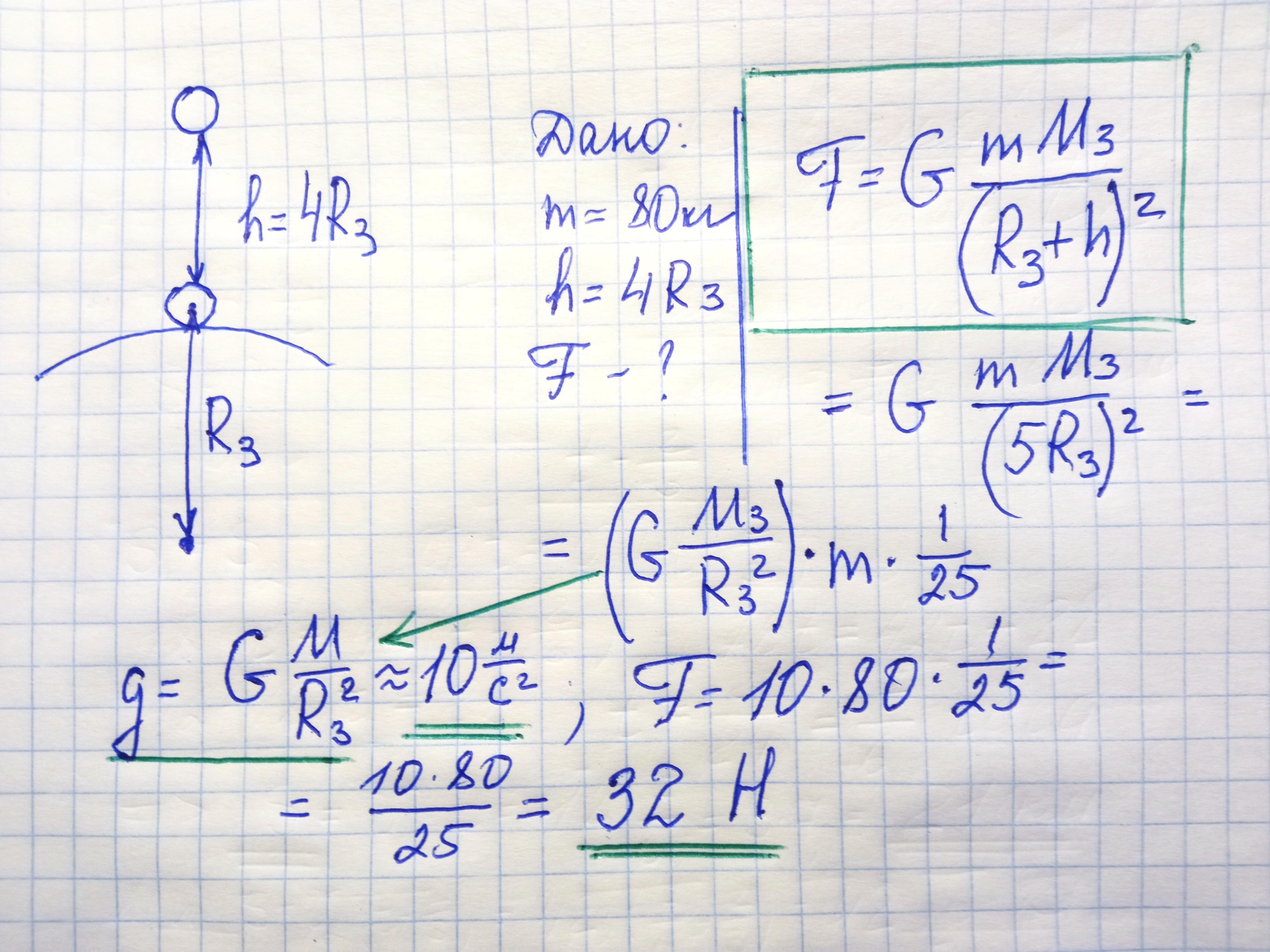 Спутник массой m=80кг находится на высоте h=4R3 ( где R3- радиус земли) определите силу тяжести F действующую на спутник