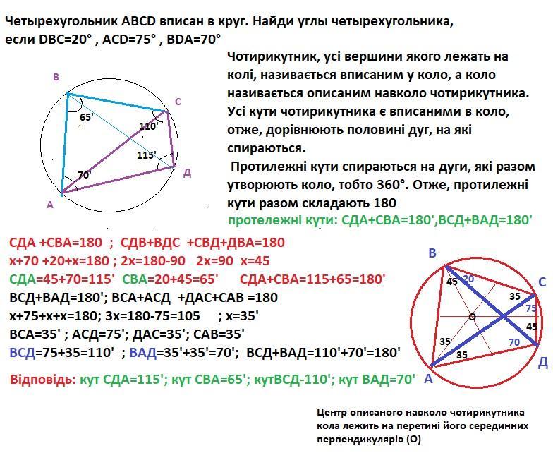 ДАМ....... БАЛЛОВЧетырехугольник ABCD вписан в круг. Найди углы четырехугольника, если L DBC=20° L ACD=75° L BDA=70° Люди, помогите, пожалуйста желательно с рисунком и быстро