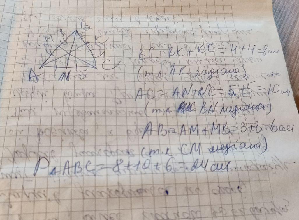 Відрізки CM BN і AK є медіанами трикутника ABC. Обчисліть його периметер, якщо BM=3 см,NC=5 см, КС= 4 см