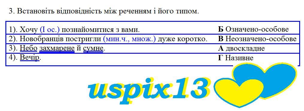 1). Хочу познайомитися з вами. - Б Означено-особове 2). Новобранців постригли дуже коротко. - В Неозначено-особове 3). Небо захмарене й сумне. - А Двоскладне 4). Вечір. - г Називне