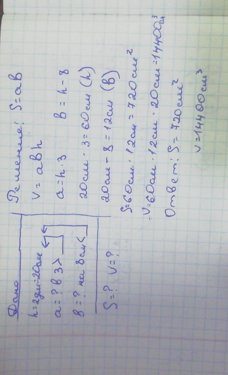 2 дм, что на 8 см больше его ширины и в 3 раза меньше его длины. Вычислите площадь поверхности параллелепипеда и его объём.