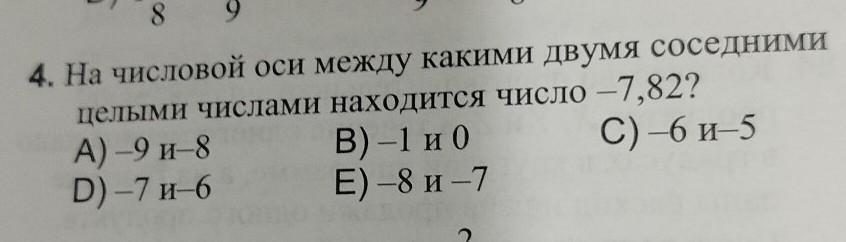 9 4. На числовой оси между какими двумя соседними целыми числами находится число -7,82 A) -9 и 8 D) -7 и 6 5. Укажите число, обратное В) -1 и 0 Е) -8 и -7 2 С)-6 и 5 15. Вы 5 A) Ob D) 16. Вь