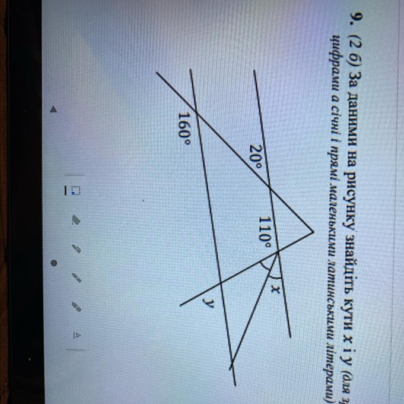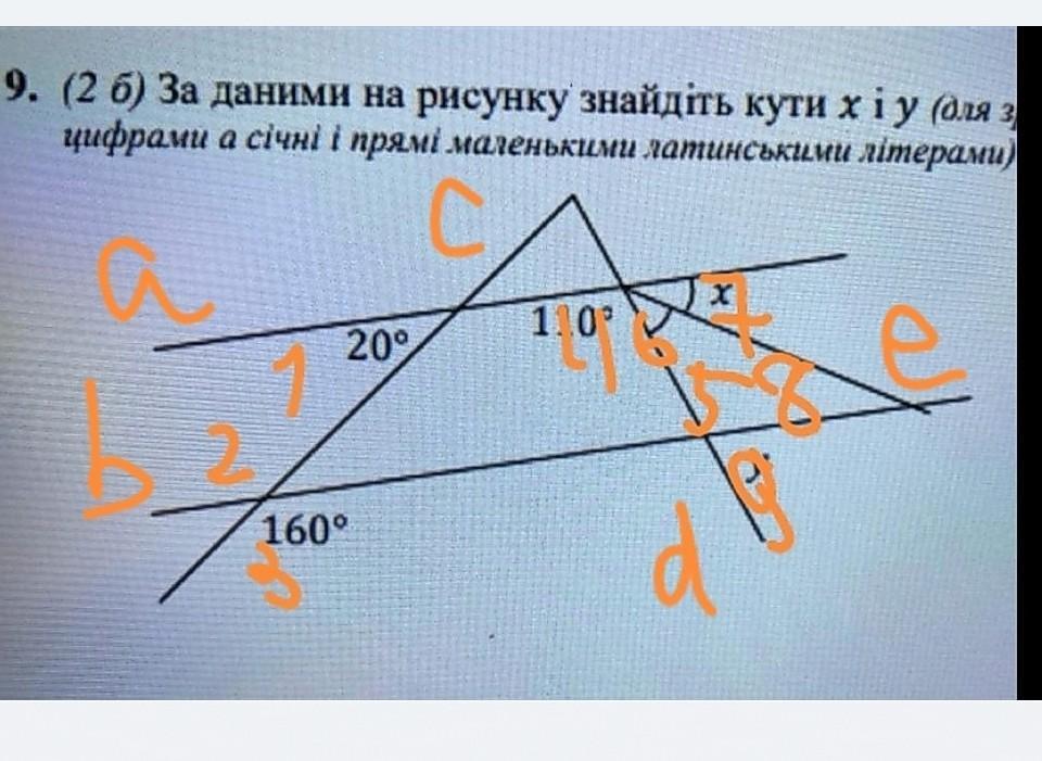 За даними на рисунку знайдіть кути x i y (для зручності позначте кути цифрами січні і прямим маленьким латинськими літерами)