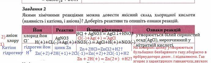 Якими хімічними реакціями можна довести якісний склад хлоридної кислоти (наявність і катіона, і аніона)? Доберіть реактиви та опишіть ознаки реакцій