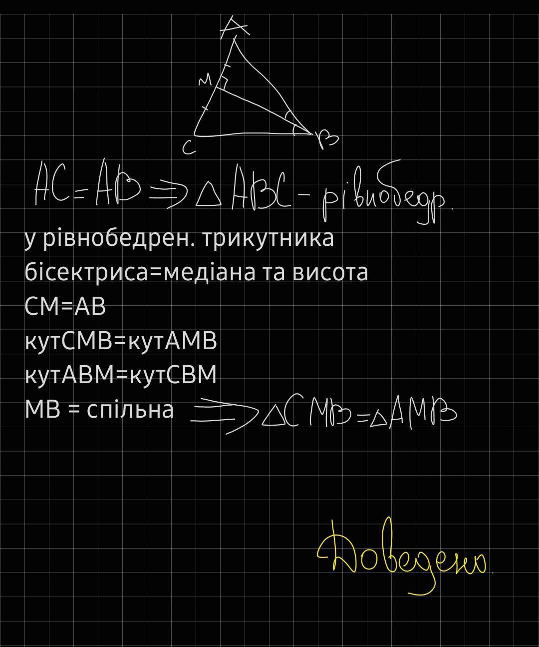 11.У трикутнику ABC сторони AB і AC рiвні, а BM-бісектриса. Доведіть, що трикутники ABM i CBM рiвнi.