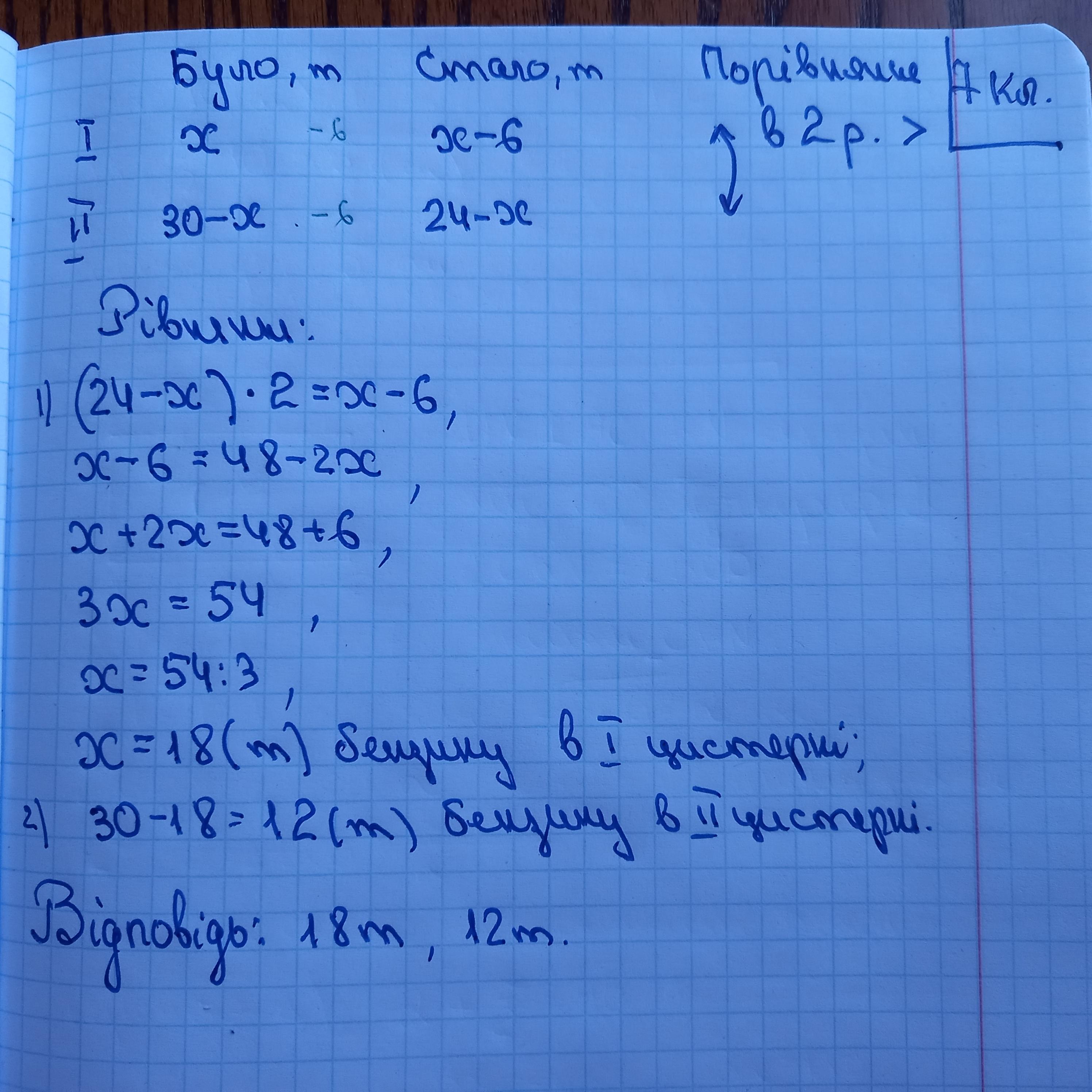В двох цистернах було 30 т бензину. Після того, як з кожної продали по 6 т бензину, то в першій залишилося в 2 рази більше, ніж у другій. Скільки тонн було в кожній цистерні спочатку?
