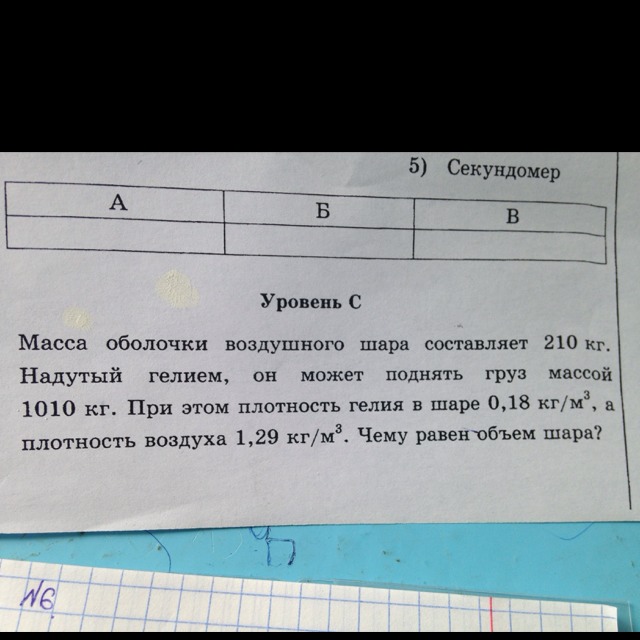 Масса оболочки воздушного шара составляет 210 кг. Надутый гелием он может поднять груз массой 1010кг. При этом плотность в шаре 0,18 кг на м3, а плотность воздуха 1,29 кг на м3