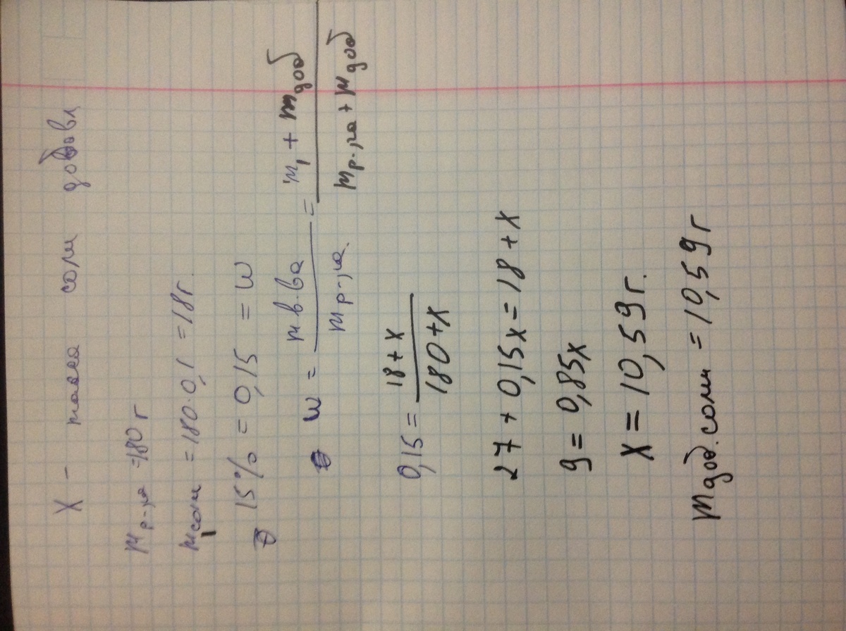 Сколько соли надо насыпать в 180 грамм раствора соли с массовой долей 10%, что-бы массовая доля соли стала 15%?