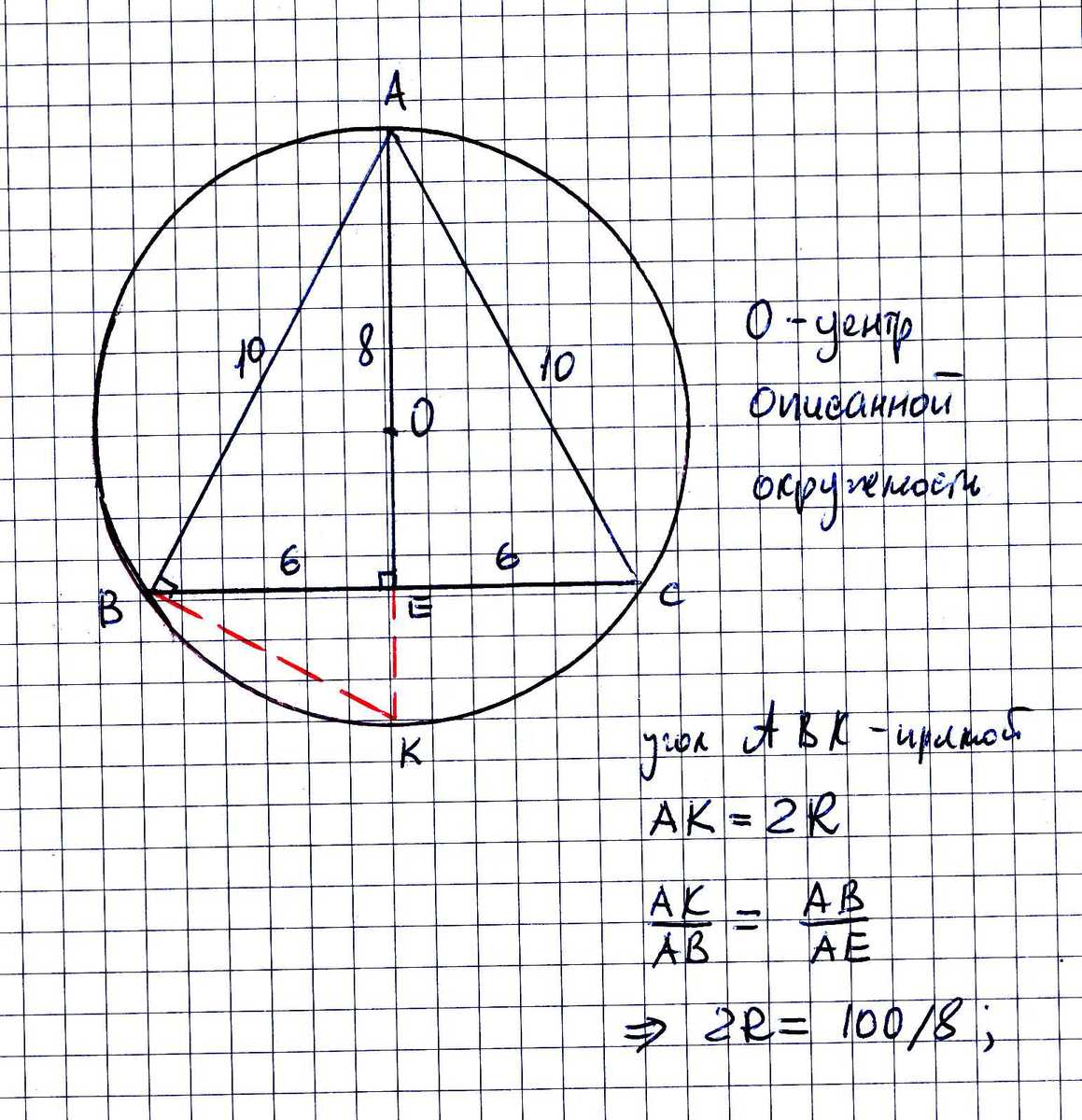 радиус описанной окружности можно сосчитать по формуле R = a*b*c/(4*S); но в данном случае есть изящный способ. Продлим биссектрису за основание и из конца боковой стороны проведем перпендикуляр к боковой стороне до пересечения с продолжением биссектрисы (я её называю, как в условии). Расстояние от вершины треугольника до полученной точки равно диаметру описанной окружности (ясно, что на так построенной окружности окажутся все вершины заданного равнобедренного треугольника. Попробуйте-ка это доказать, хотя это почти очевидно. Если не выйдет, у вас всегда есть формула для R :)) Кроме того, полученный треугольник тоже подобен египетскому, но на месте катета 8 у него боковая сторона длины 10, поэтому гипотенуза его, (равная 2*R) равна 10*10/8;
