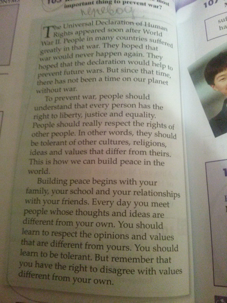 Создание мира начинается с твоей семьи, школы и твоих отношений с друзьями. Каждый день ты встречаешь людей, чьи взгляды и идеи отличаются от твоих. Ты должен научиться быть терпимым. Но, запомни, что у тебя есть право не соглашаться с ценностями, различными от твоих.