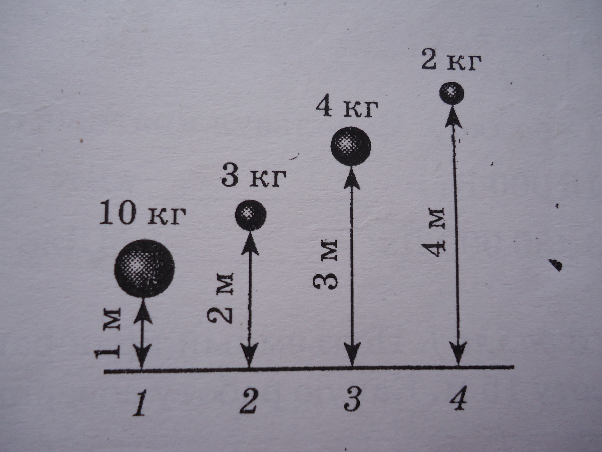"На рисунке (внизу) представлено расположение четырех тел разной массы, находящихся на расстояниях от поверхности Земли. Какое из этих тел имеет наименьшую потенциальную энергию относительно поверхности Земли?"