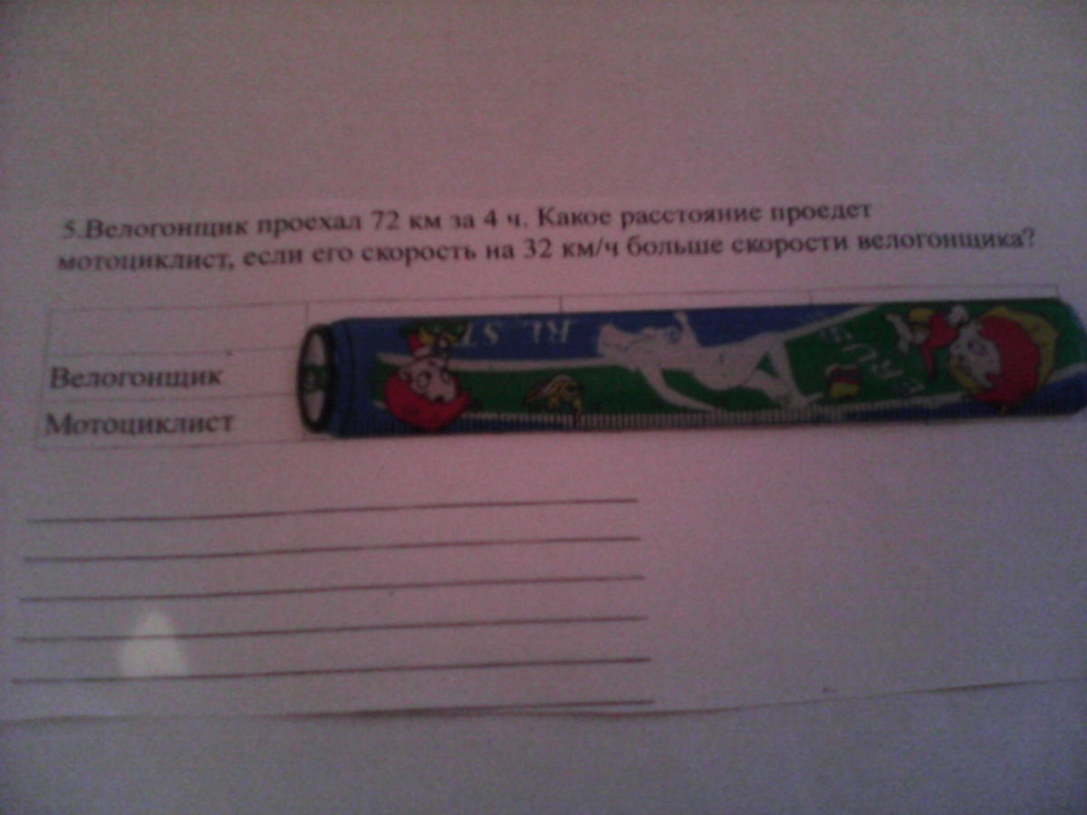 1 } 72 дели на 4 = 18 км ч -скорость велогонщика, 2] 18+32* 4 =200км пройдёт матоцеклист, может с ошбками