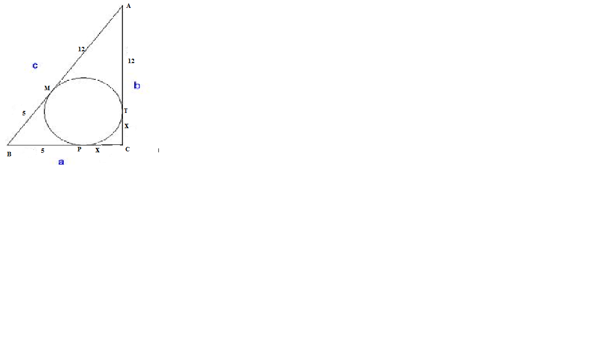 ВМ =ВР=5, АМ=АТ=12, СТ=СР = х, тогда по теореме Пифагора: