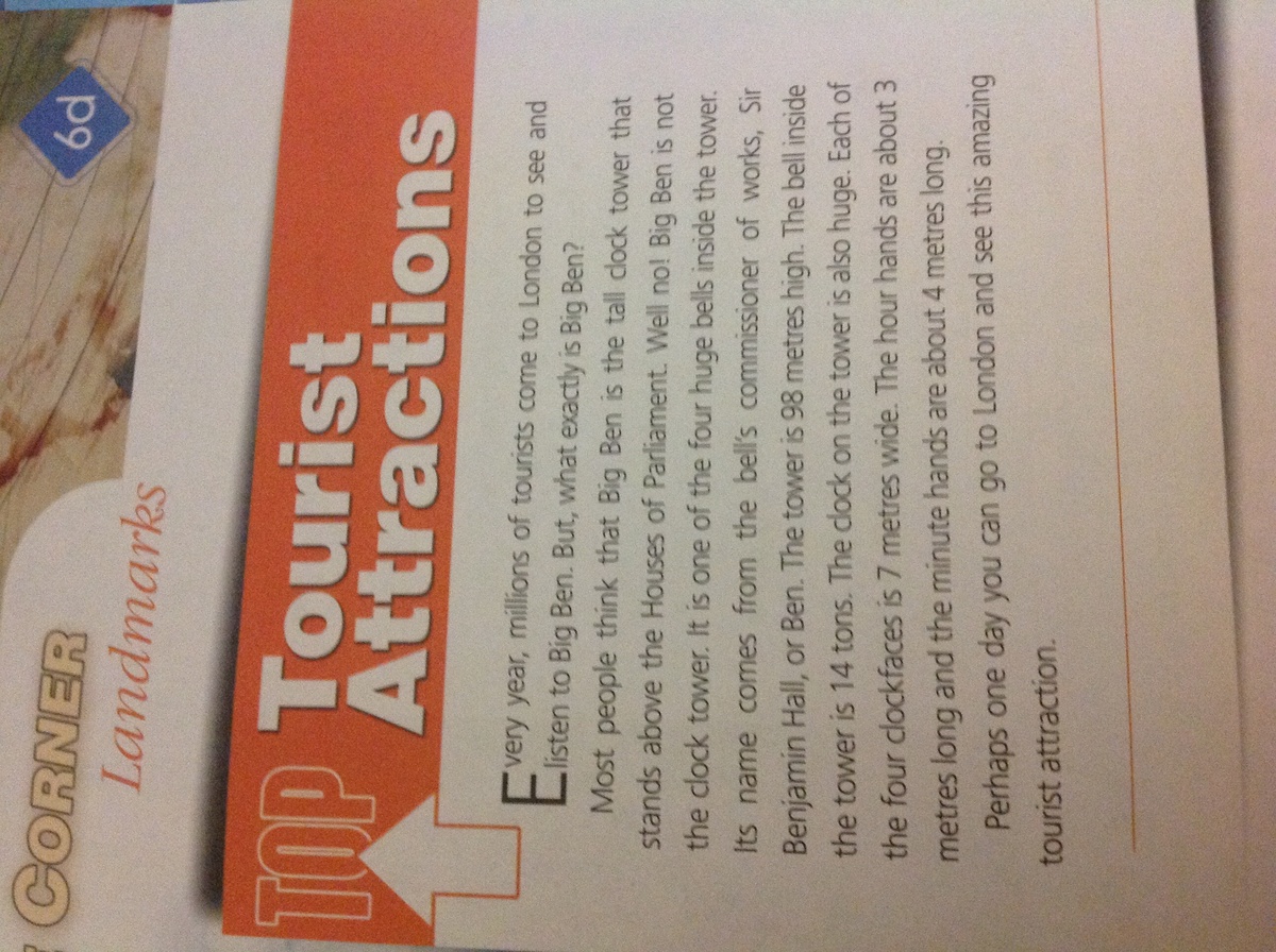 Большинство людей думают что Биг Бен это высокая часовая башня которая стоит над домами парламента. Совсем нет. Биг Бен не часовая башня. Это один из четырех огромных колоколов внутри башни. Имя пришло из колокольного уполномоченного работ, сэр Бенджамин Холл или Бен. Башня 98 м высоты. Колокол внутри башни 14 т. Часы на башне также огромные. Каждый из четырех циферблатов 7 м шириной. Часовые стрелки около 3м длины и минутные стрелки около 4м длины.