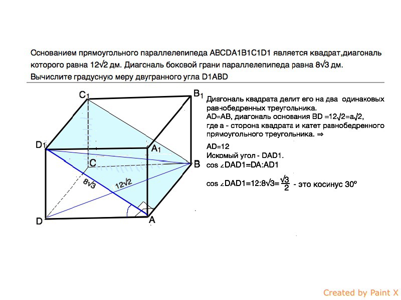 помогите срочно!!!!!!(желательно с рисунком) Основанием прямоугольного параллелепипеда ABCDA1B1C1D1 является квадрат,диагональ которого равна (12 корней из 2)дм. Диагональ боковой гранипараллелепипеда равна (8 корней из 3)дм. Вычислите градусную меру двугранного углаD1ABD
