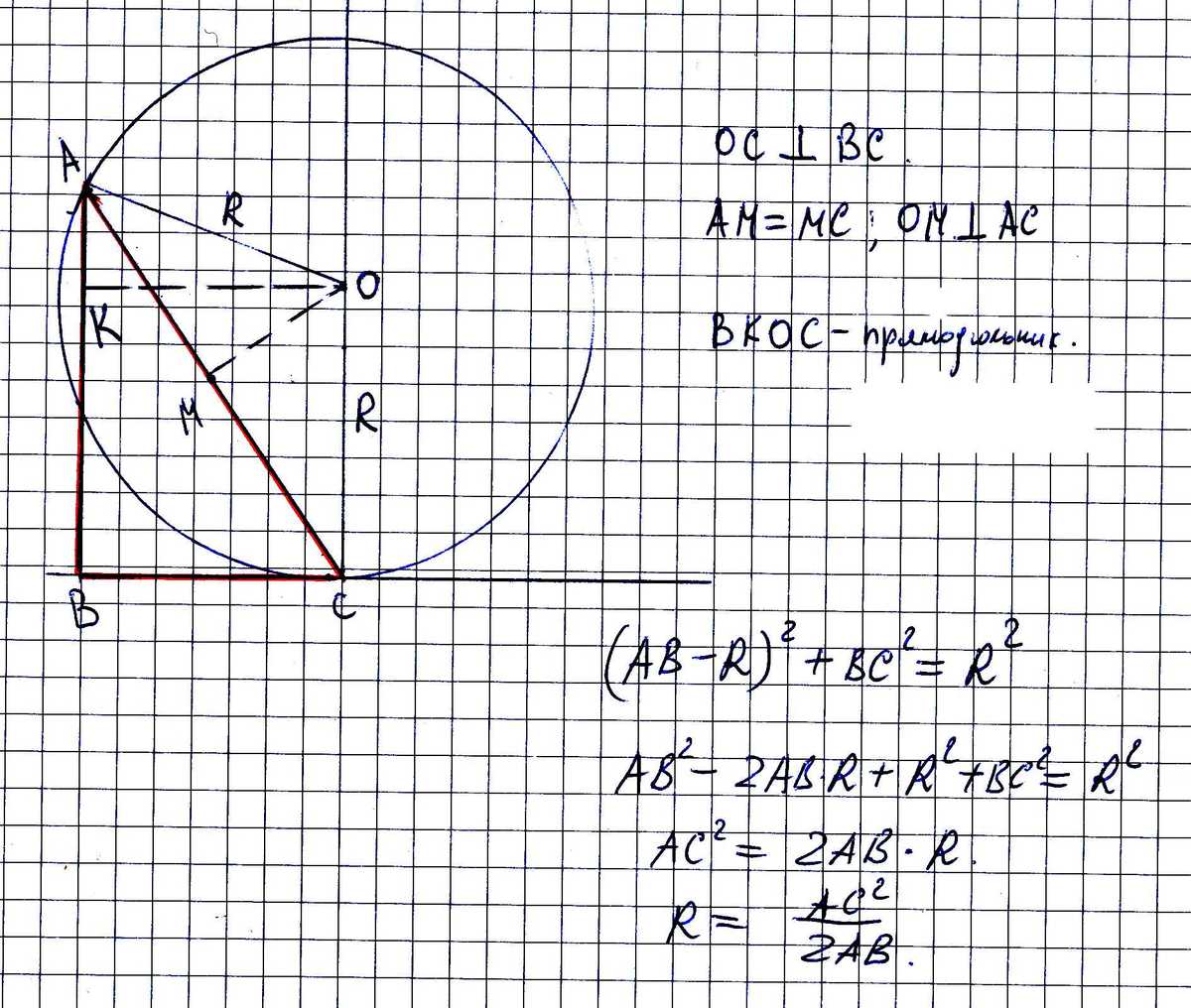 Окружность проходит через точки А и С, и к тому же в точке С - касается (не может она в другой точке касаться, а в этой пересекать :))) так не бывает). То есть центр окружности лежит на пересечении перпендикуляра к ВС в точке С и перпендикуляра к АС в точке М - середине АС(то есть такая точка - единственная). Осталось найти на перпендикуляре из точки С к ВС такую точку О, что АО = ОС = R.