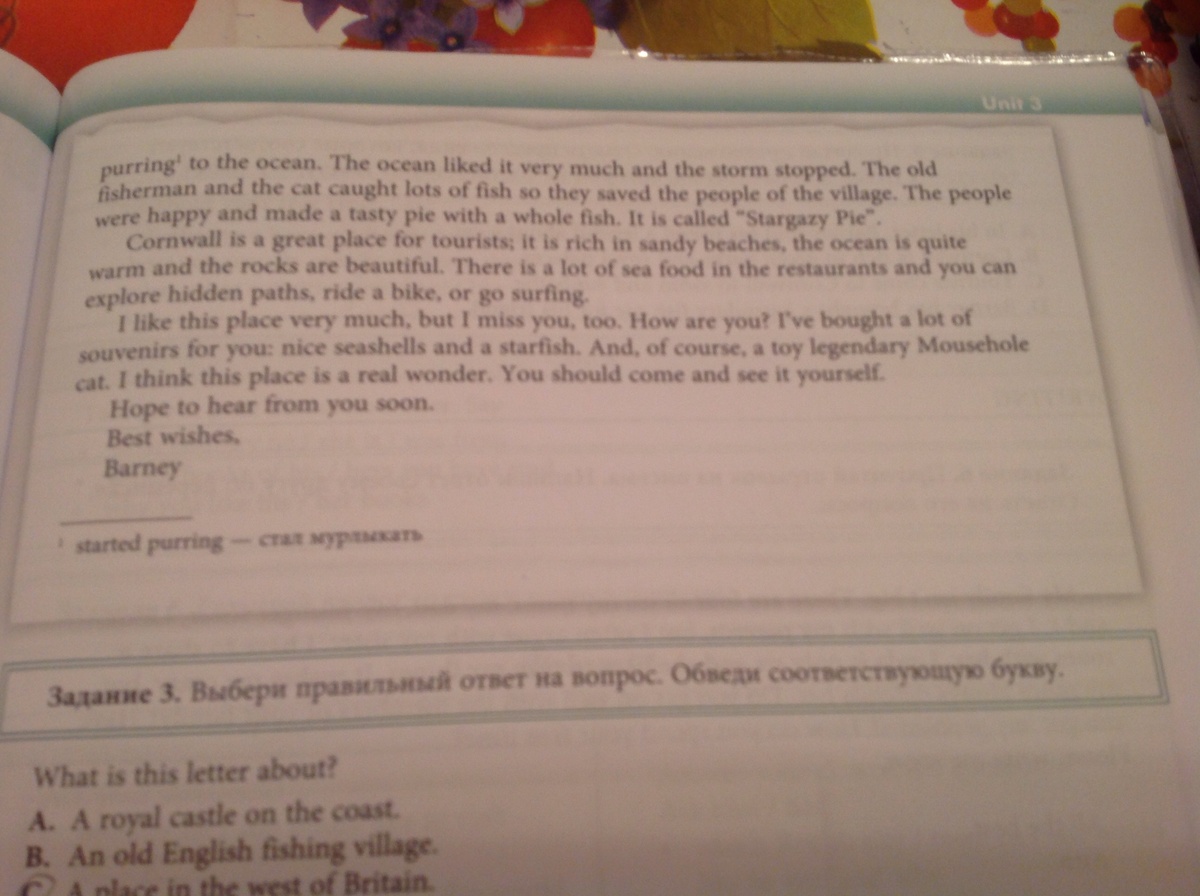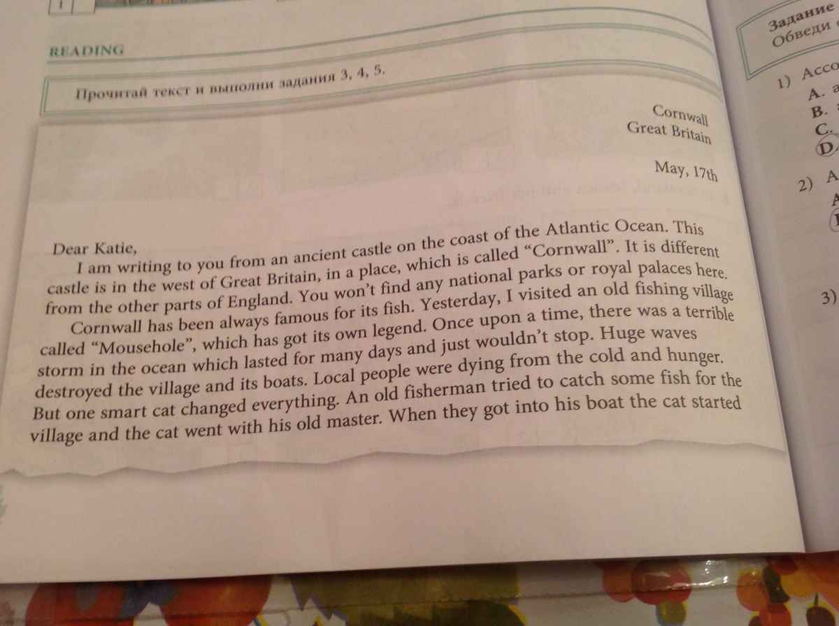 Я пишу тебе с древнего замка на берегу Атлантического океана. Этот замок находится на западе Великобритании, в месте под названием "Корнвол". Оно отличается от других частей Англии. Здесь вы не найдете национальных парков или королевских дворцов .