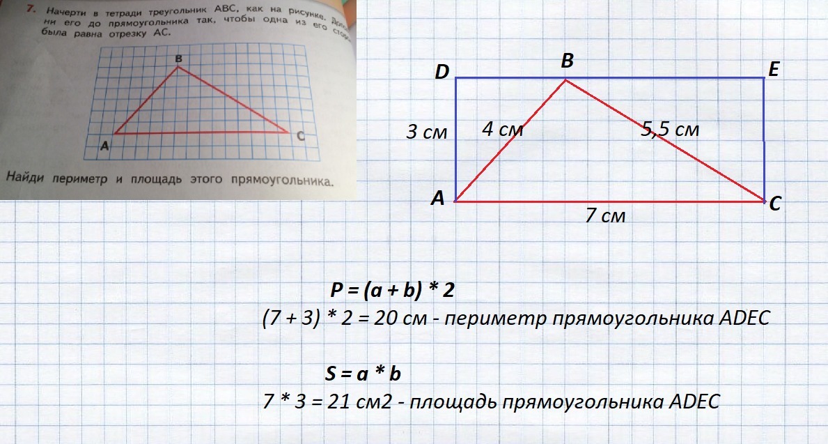 начерти в тетради треугольник ABC как на рисунке AB-4cм, AC-7СМ, BC-5,5СМ. дополни его до прямоугольника так чтобы одна из его сторон была равна отрезку AC. Найти периметр и площадь этого прямоугольника.