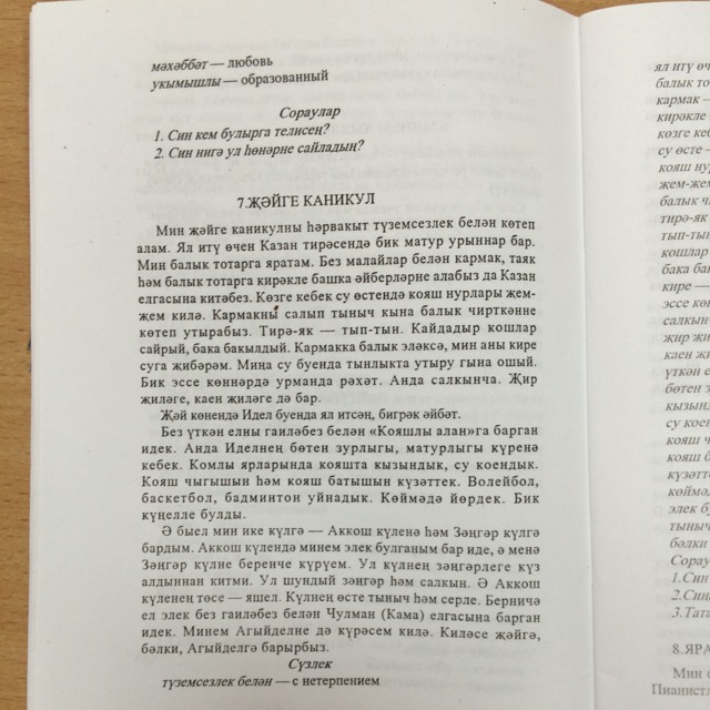 А в этом году я поехал на два озера - на Лебединое (или возможно Озеро Лебедей, не знаю) и на Голубое (или Синее). На Лебедином озере я и раньше бывал, а вот Голубое - увидел в первый раз. Оно такое синее и холодное. А цвет Лебединого озера - зеленое. Поверхность озера тихая и таинственная. Несколько лет назад мы с семьей ездили на реку Чулман. Я хочу увидеть и Агыйдел. На следуюющее лето, возможно, и поедем на Агыйдел.