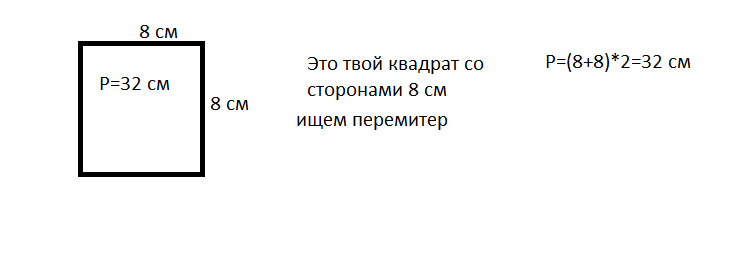 Помечаем 8 см у квадрата потом вспоминаем как найти периметр Р=(8+8)*2=32 см равен периметр квадрата