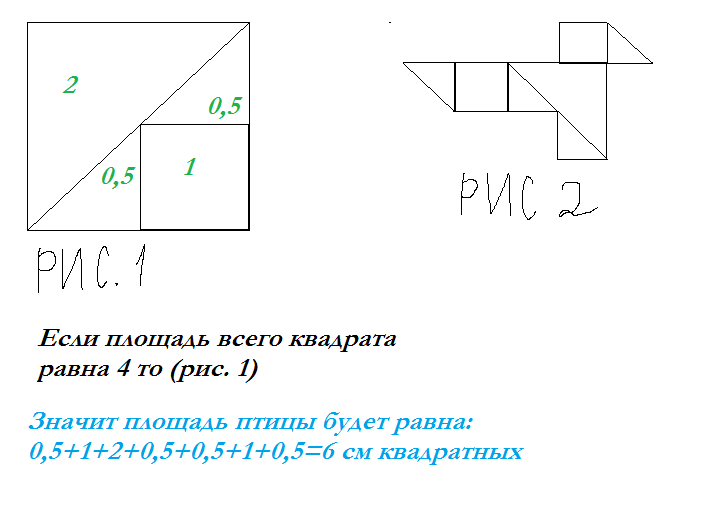 У Ванды несколько квадратных листков бумаги площади 4. Она разрезает их на части, как показано на рисунке 1(на квадрат и три прямоугольных треугольника). Из нескольких таких частей Ванда сложила птичку, как показано на рисунке 2. Чему равна площадь этой птички?