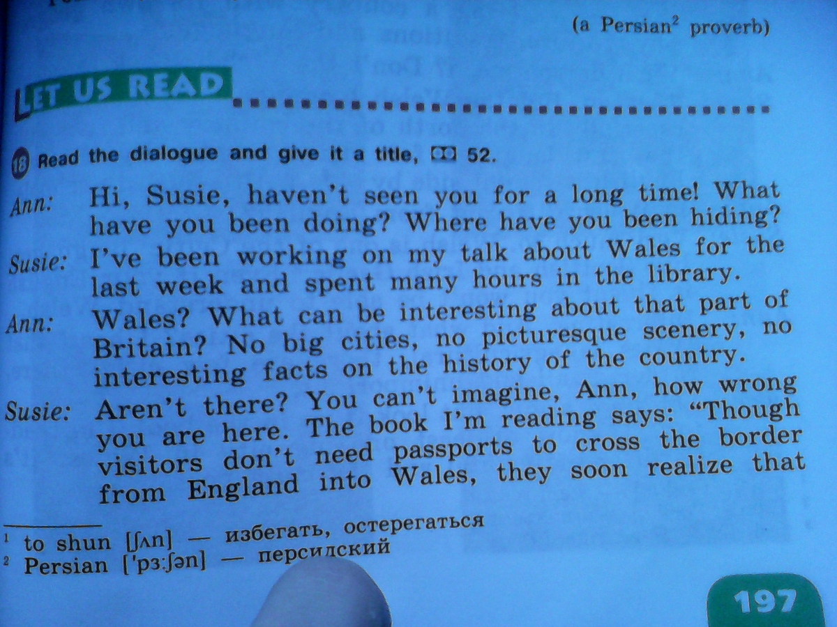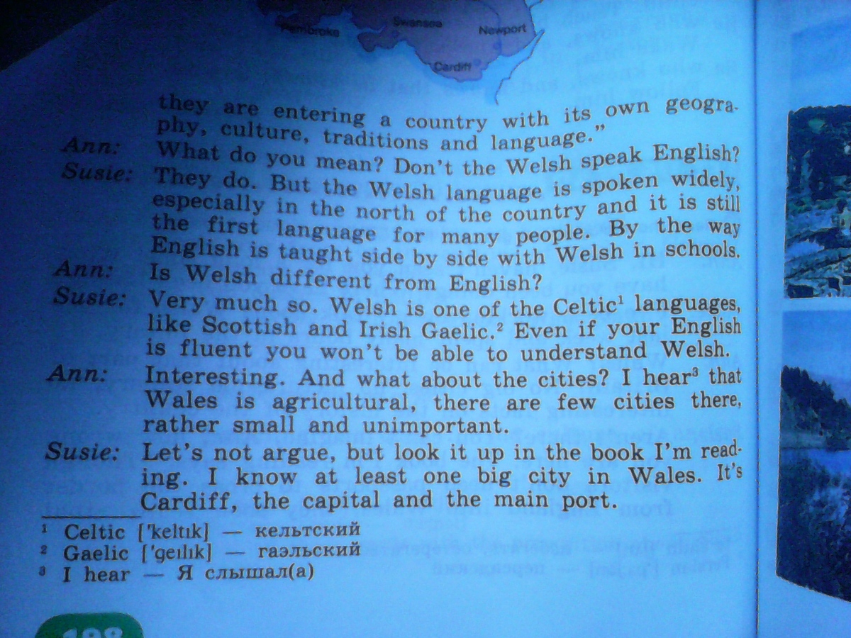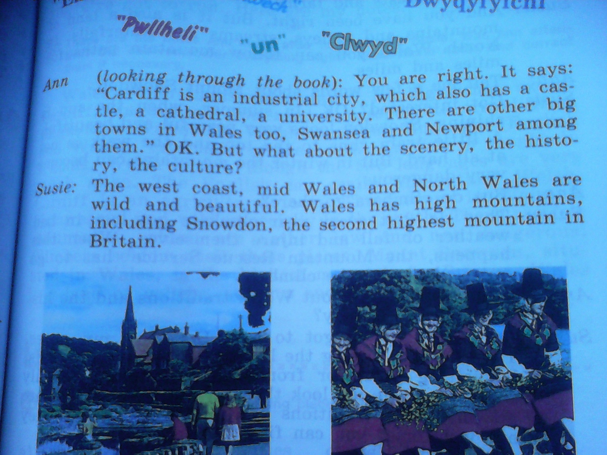 Энн: (Смотрит в книгу) Ты права, здесь говорится: "Кардифф - индустриальный город, где есть замок, собор и университет. В Уэльсе есть еще два больших города Суонси и Ньюпорт. Ладно, но как насчет пейзажей, культуры и истории?