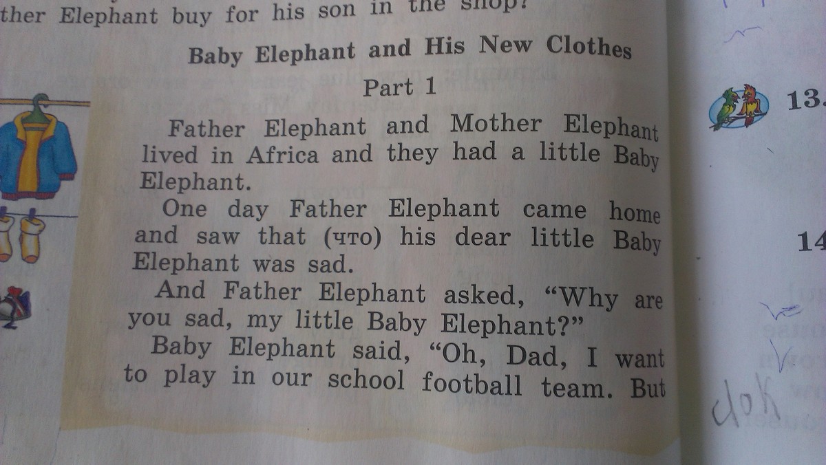 Папа Слон и Мама слон жили в Африке и у них был детеныш Слоненок. Однажды Папа Слон заметил, что его дорогой детеныш был грустным. И папа слон спросил "Почему ты грустный, мой детеныш?" Детеныш сказал "О, папа, я хочу играть в школьной футбольной команде. Но."