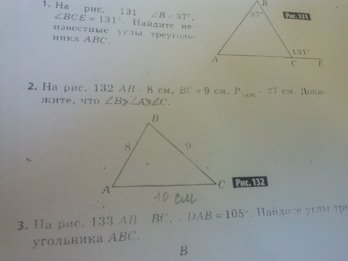 Вспомним свойство: против большего угла лежит большая сторона. Напротив стороны в 10 см лежит угол В. Следовательно он самый большой. напротив стороны в 9 см лежит угол А. Значит он средний угол и B>A. Угол С самый маленький потому что лежит напротив меньшей стороны. Из этого следует, что B>A>C.