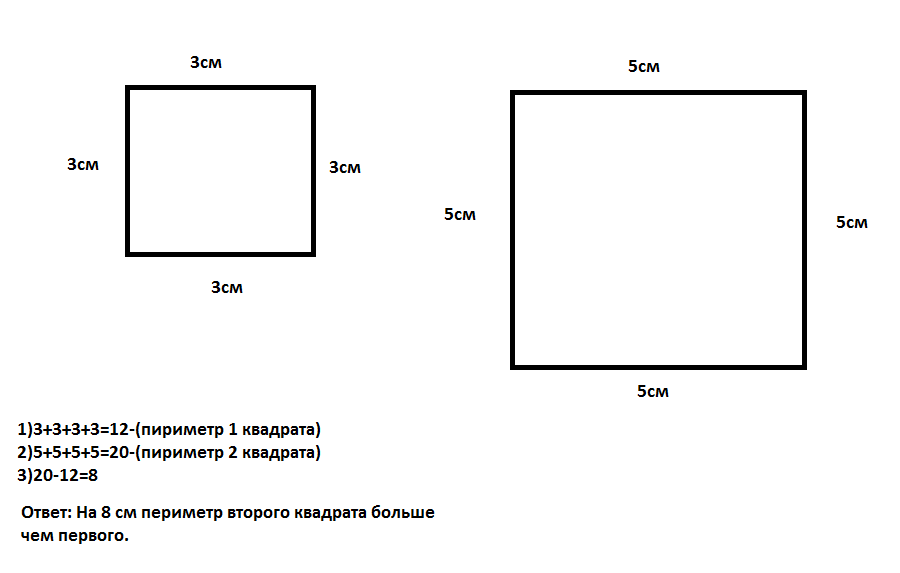 нарисуй квадрат со стороной 3см увеличь его стороны на 2 см и построй еще один квадрат на сколько периметр второго квадрата больше чем периметр первого
