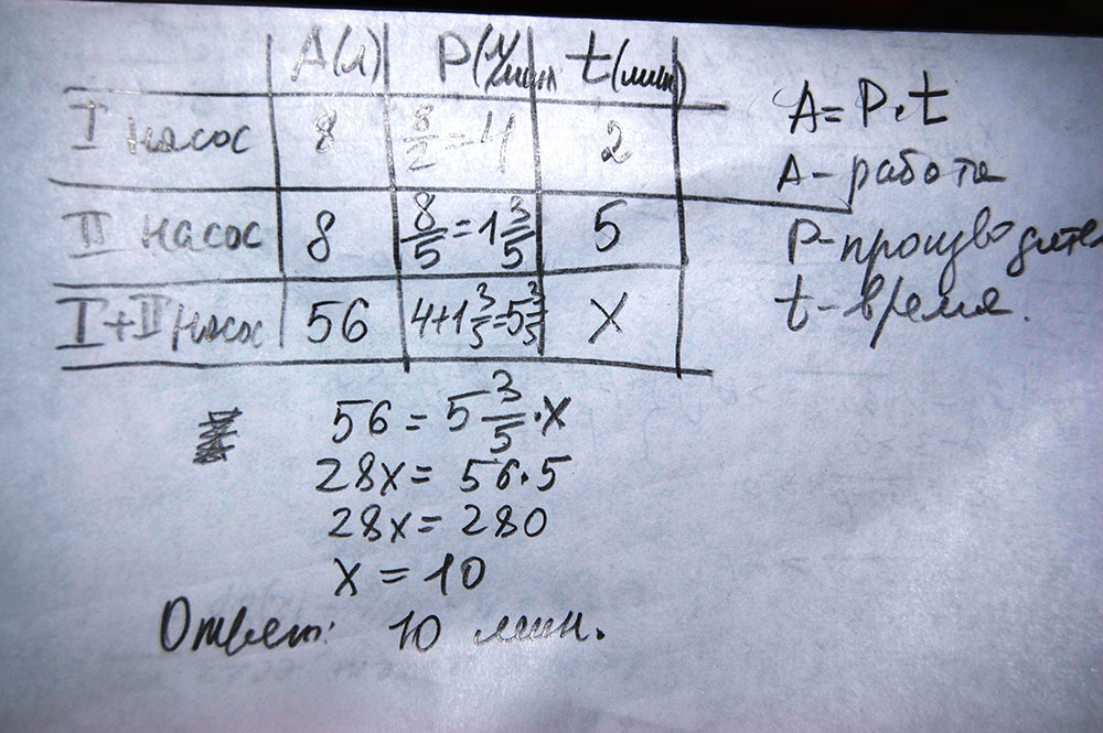 В помощь садовому насосу, перекачивающему 8 литров воды за 2 минуты, подключили второй насос, перекачивающий тот же объем воды за 5 минут. Сколько минут эти два насоса должны работать совместно, чтобы перекачать 56 литров воды?