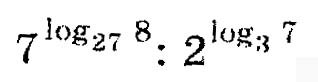 7^log(27) 8 : 2^log(3) 7=7^( (log(7) 2 /log(7) 3) :2^(log(2) 7/log(2) 3)=(7^log(7) 2)^(1/log(7) 3) :(2^log(2) 7)^(1/log(2) 3)=2^(1/log(7) 3) : 7^(1/log(2) 3=2^(1:(log(2)3/log(2)7)) :7^(1:(log(7) 3/log(7) 2))=2^(log(2) 7/log(2) 3) : 7^(log(7) 2 / log(7) 3)=7^(1/log(2) 3 ) : 2^(1/log(7)3)=7^(log(7) 2/log(7) 3) :2^(log(2) 7 /log(2)3)=2^(1/log(7)3) : 7^(1/log(2) 3)=