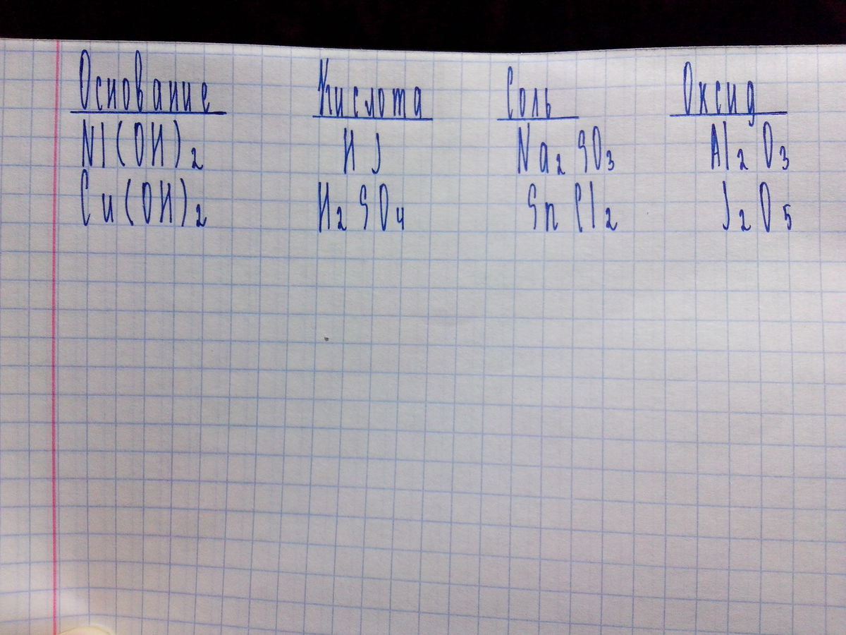 NI(OH)2, HJ, NA2SO3, J2O5, H2SO4, CU(OH)2, AI2O3, SnCI2