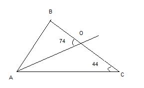2) в треугольнике АВС проведена бессектриса АО,< С =44 градуса, <АОВ=74градуса. найдите угол В