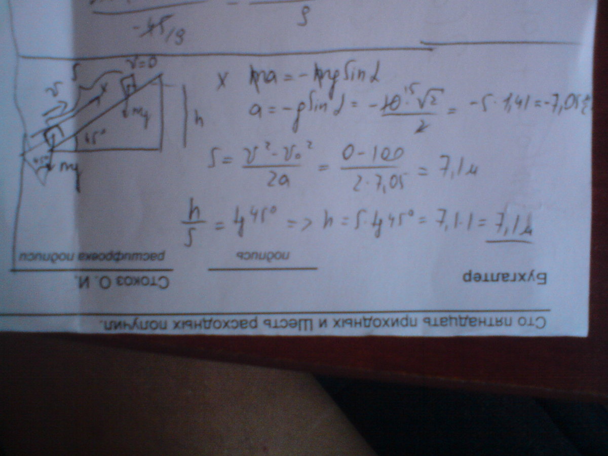 вверх по горке толкнули льдинку,сообщив ей скорость 10 м/с. На какую максимальную высоту поднимиться льдинка, если трение отсутствует,а угол наклона горы 45 градусов к горизонту