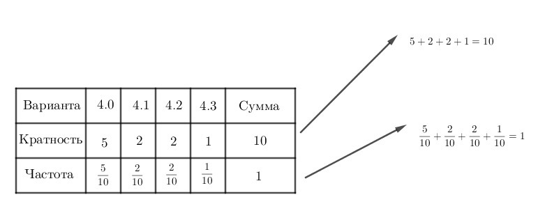 На соревнованиях по фигурному катанию спортсмены за произвольную программу получили следующие баллы: 4,2; 4,1; 4,0; 4,0; 4,2; 4,3; 4,0; 4,0; 4,1; 4,0. Составьте таблицу распределения данных, найдите объем, кратность, частоту измерения.