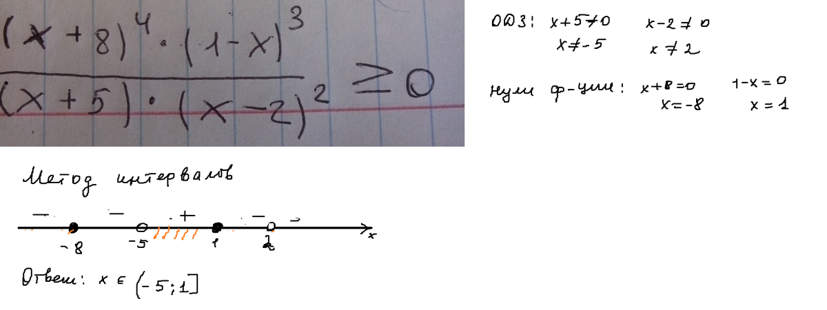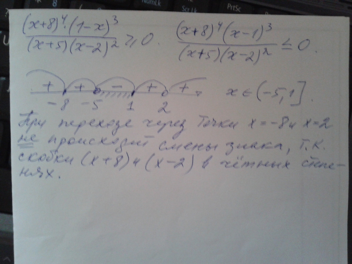 Приравниваешь каждую скобку к нулю, получаешь точки, которые делят числовую ось на интервалы.В каждом интервале выбираешь любую точку и считаешь знак функции (дроби).Учитываешь, что знаменатель не должен =0.А затем выбираешь необходимые промежутки по знаку всего неравенства.