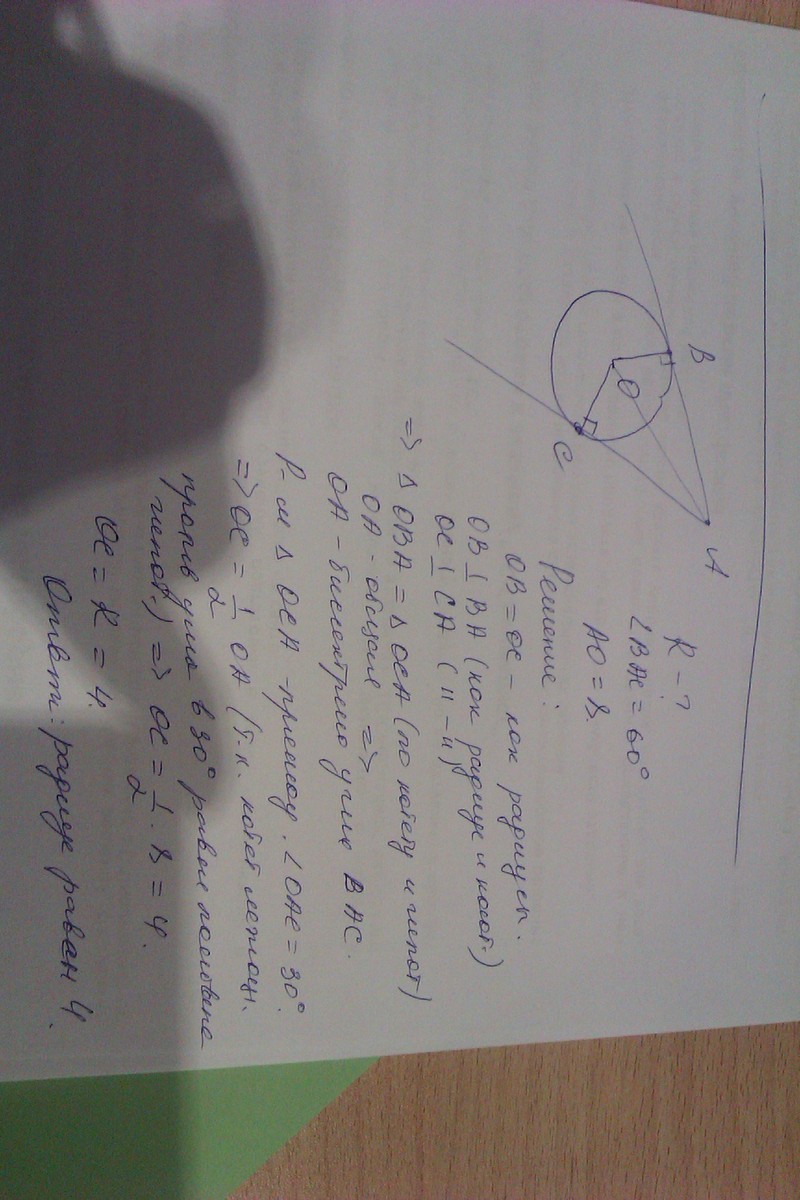 Из точки А проведены две касательные к окружности с центром в точке О. Найдите радиус окружности, если угол между касательными равен 60°, а расстояние от точки А до точки О равно 8.