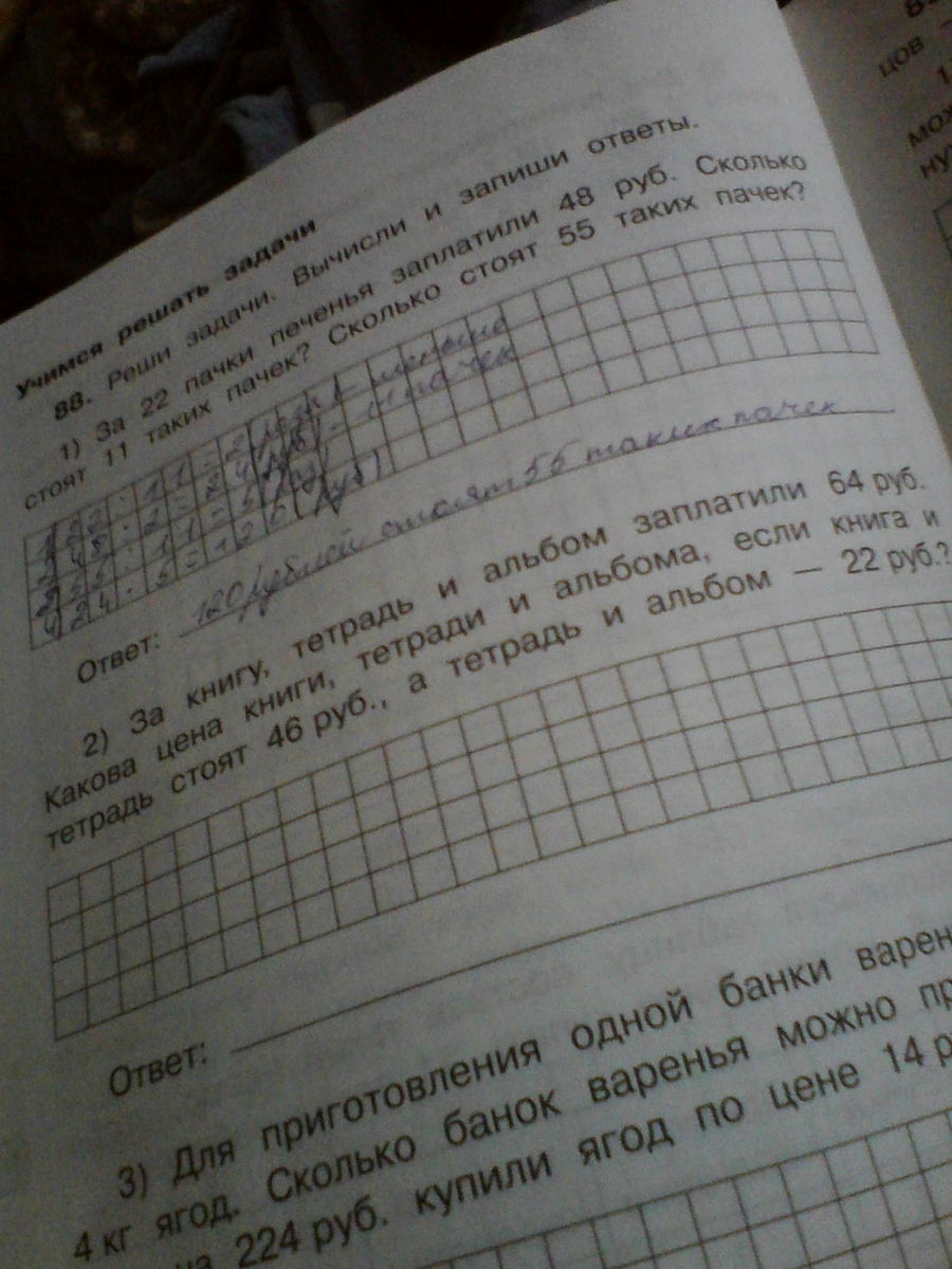 помогите пожалуйста решить задачу.За книгу, тетрадь и альбом заплатили 64 рубля.Какова цена книги , тетради и альбома если книга и тетрадь стоят 46 рублей, а тетрадь и альбом 22 рубля..?