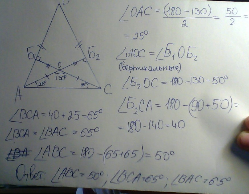 В равнобедренном треугольнике ABC с основанием AC из вершин A и C проведены высоты Б которые при пересечении образуюти угол 130 градусов. Найдите углы этого треугольника.