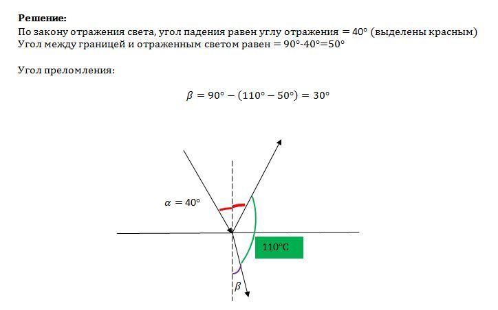 Луч света падает на плоскую границу раздела двух сред. Угол падения равен 40 градусов, угол между отраженным лучом и преломленным 110 градусов. Чему равен угол преломления?