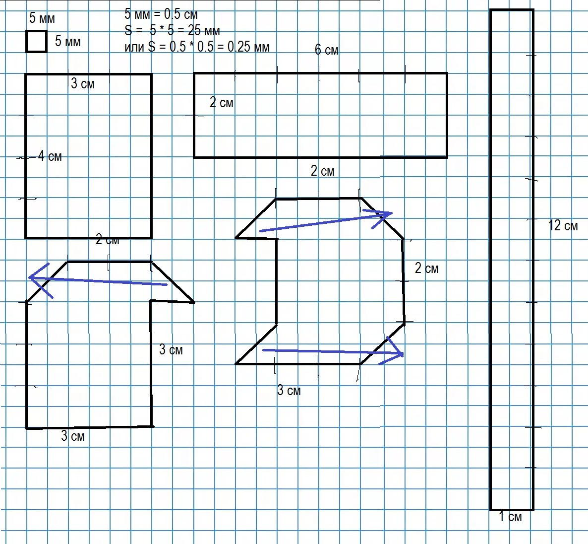 найдите площадь одной клетки тетрадного листа.На этом листе бумаги постройте 5 различных многоугольниковс площадью 12кв.см.
