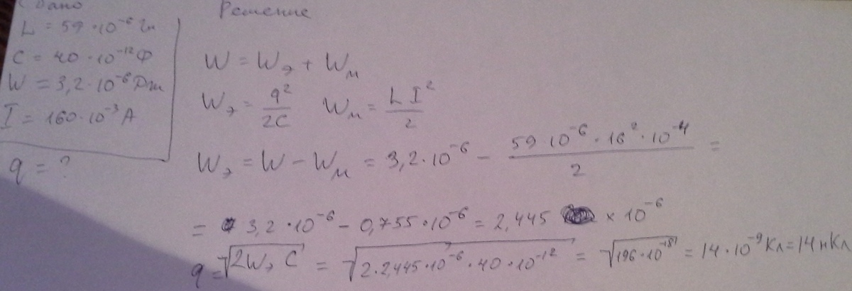 колебательный контур состоит из катушки индуктивности 59 мкГн и конденсатора 40 пФ энергия запасенная в контуре равна 3,2* 10^-6 дж. чему равен заряд на конденсаторе в тот момент когда ток в цепи равен 160 мА