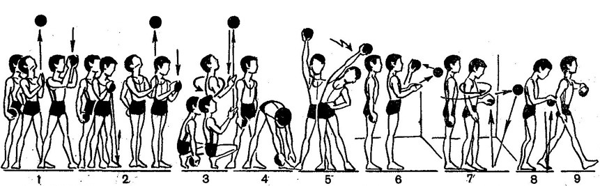 9. Мяч в правой руке. Ходьба широким шагом в течение 40—50 сек. Дыхание свободное.